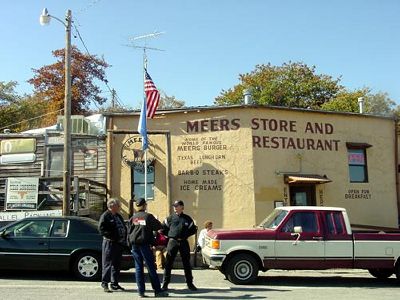 ![]() Photo by Kay Lynn Dragoo Bill Chaffin, Curtis Welch and Ken Monroe stand guard outside the Meers restaurant. This place is known for its hamburgers and desserts. The reputation is well deserved. We stopped here for lunch on Saturday. |